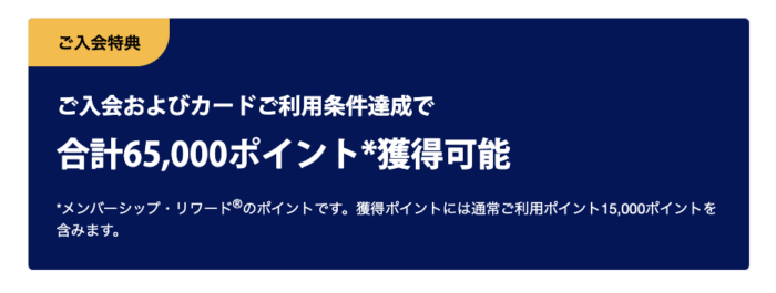 現在開催されている、アメックスゴールドプリファードの入会キャンペーンでは下記の条件をクリアすることで最大65,000ポイントの獲得が可能です。