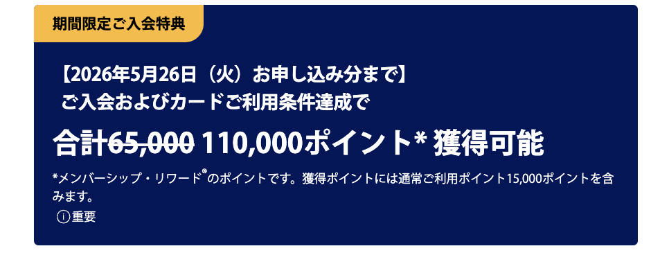 3年分の年会費相当の最大110,000ポイントの獲得ができるため、ぜひカードを積極的に活用し条件達成できますと大変お得に入会できます。