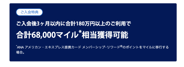 ANAアメックスゴールドを公式サイトから入会した場合は、3ヶ月180万円の決済で68,000マイルを獲得することができます。