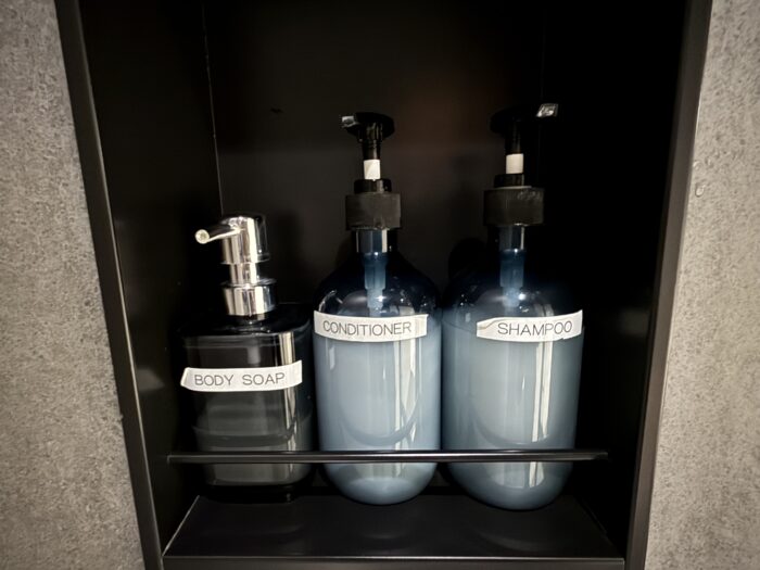 シャンプー類は詰め替えボトルに入っていて、銘柄は不明でした。