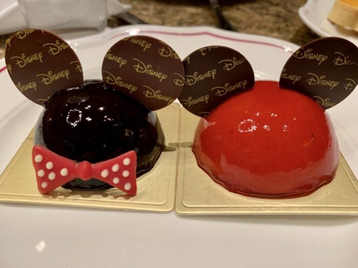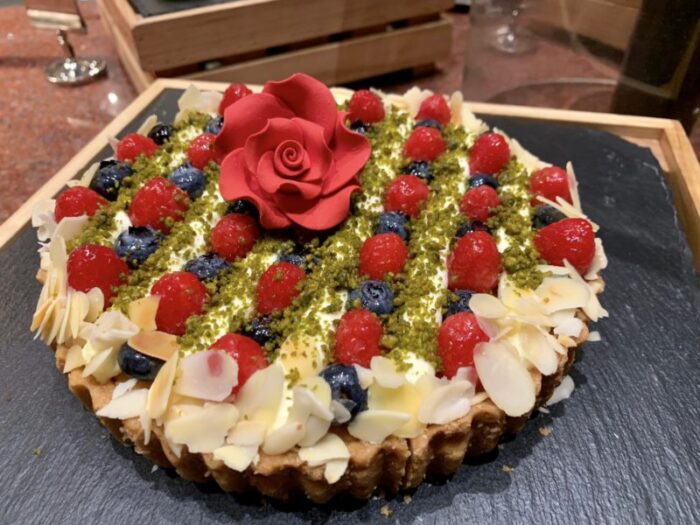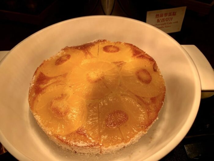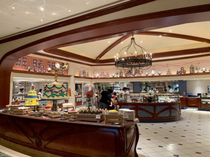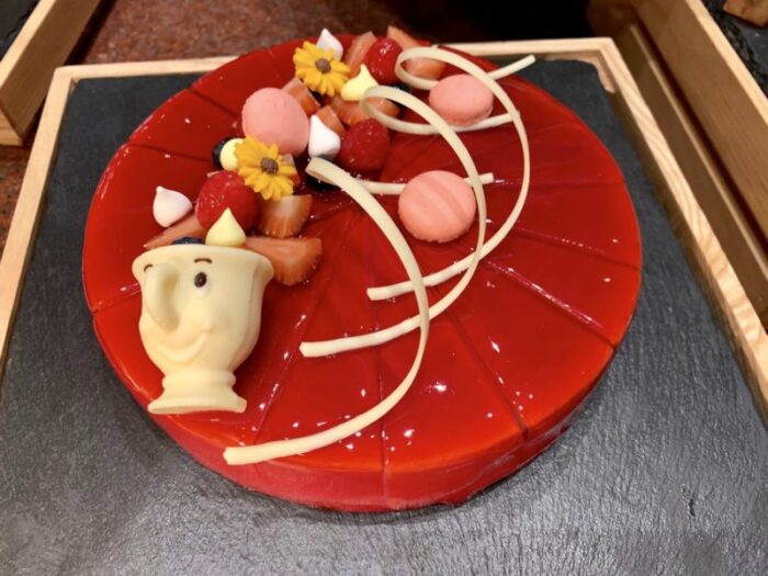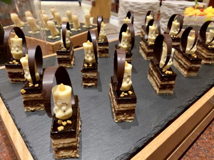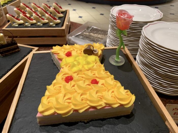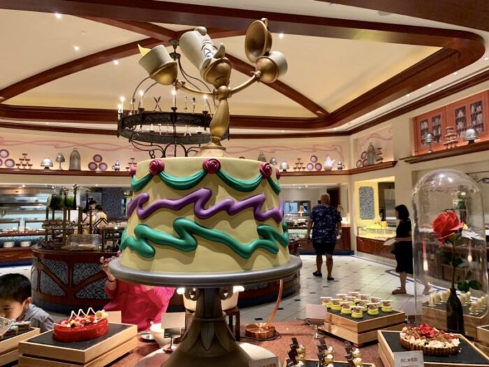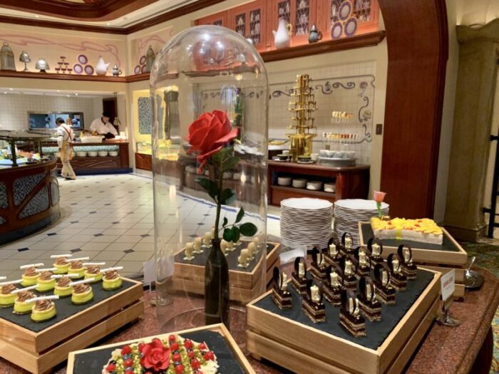 ビュッフェエリアの正面には、デザートコーナーがあり、ケーキの上に立つ「ルミエール」と「魔法のバラ」が飾ってあります。