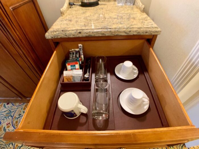 コーヒーメーカーはなく、Blendyのインスタントコーヒーとお茶のティーパックのみです。