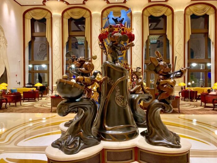 上海ディズニーランドホテルに入ると、正面にミッキーと仲間たちがオーケストラの銅像がお出迎えをしてくれます。