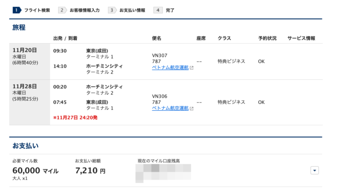 予約はANAマイルを使って60,000マイルで往復予約をしています。