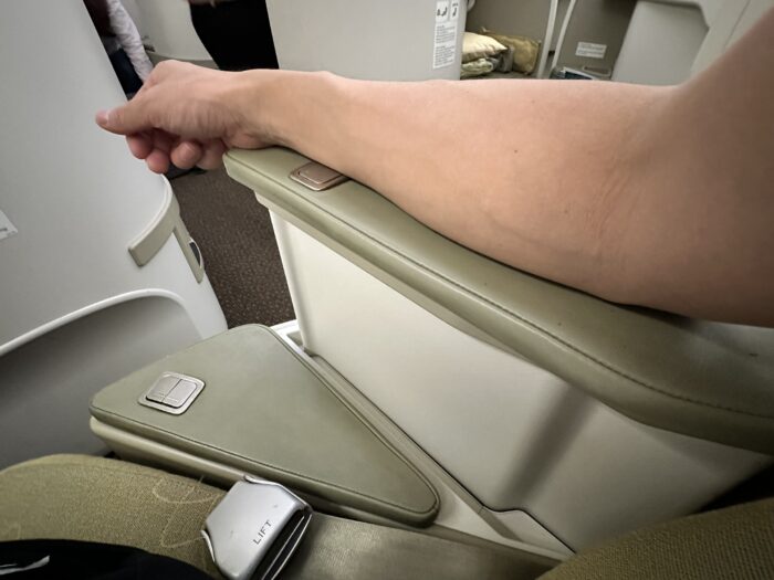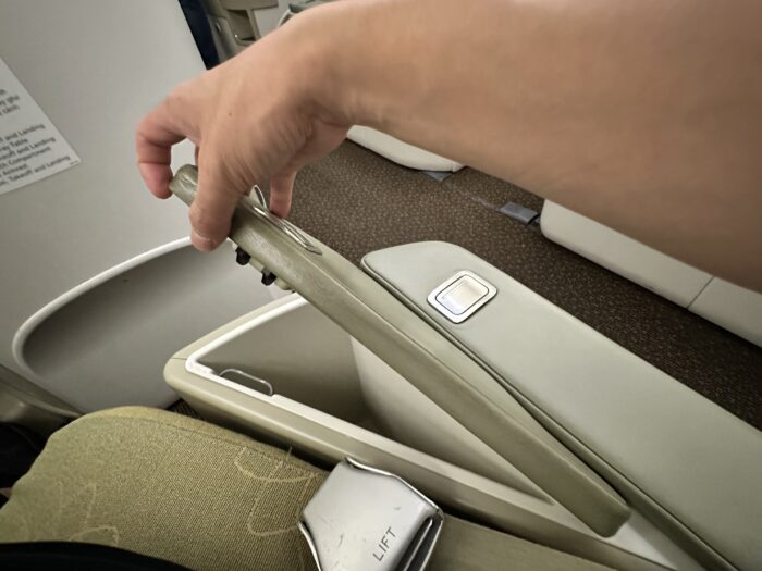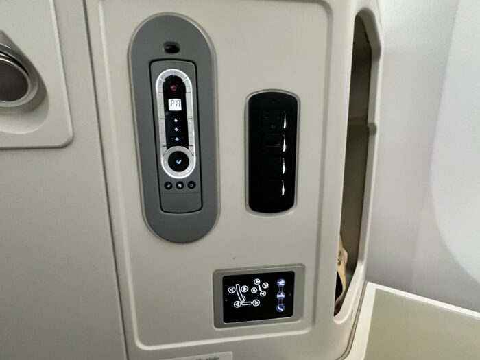 窓側にエンターテイメントのリモコンとリクライニングのスイッチがあります。
