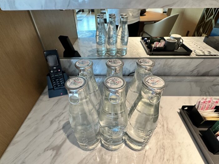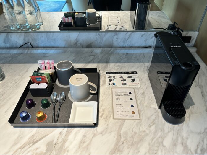 無料のお水は瓶入りのものが6本用意されており、ネスプレッソのコーヒーマシンも完備されています。