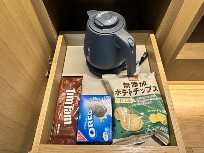 スナックと一緒に電気ケトルも置かれていました。