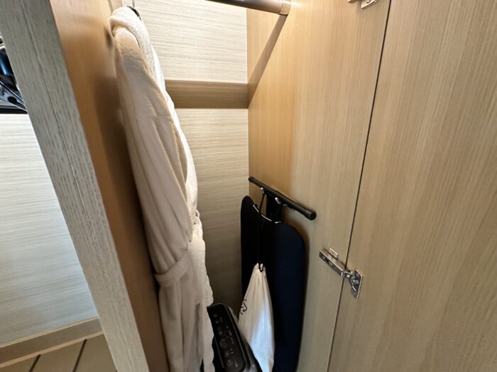 奥側の扉を開けると、バスローブ、アイロンセットが収納されていました。
