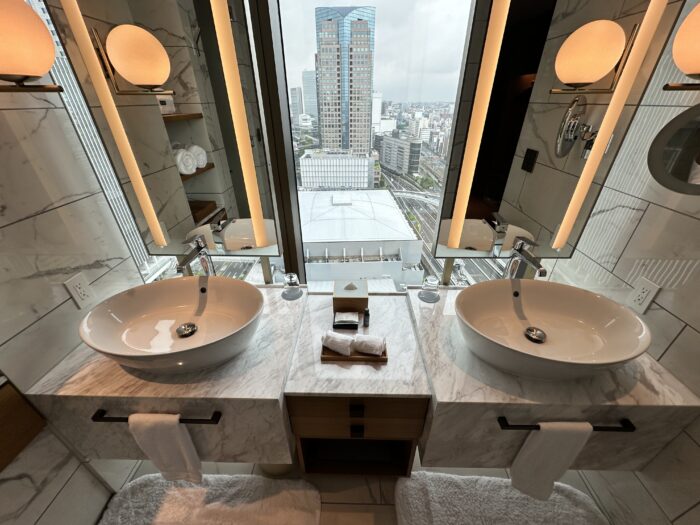 洗面台はダブルベイシン(2つのボウル)になっているため、2人で同時に身支度をしてもストレスがありません。